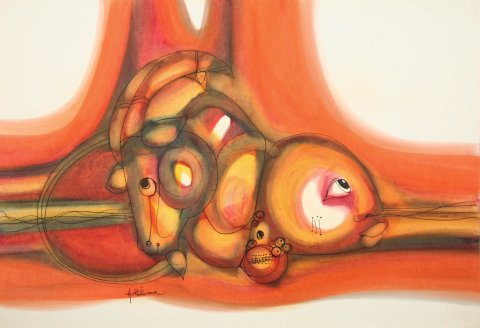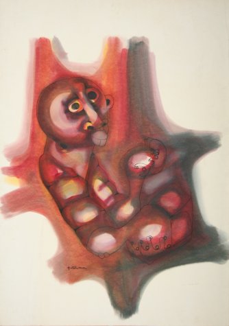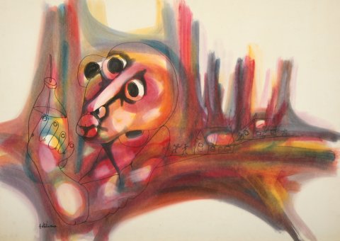 His more recent exhibitions abroad were in Denmark, Zurich and San Diego in February 1986. He has also exhibited at the Oglethorpe University Art Gallery in Atlanta Georgia in the late 1980's. Hargreaeves passed away in 1999. Hargreaves used the technique of blowing diluted oils onto paper, wiping the excess with cloth and cotton swabs then inking over the colour background when it is dry.