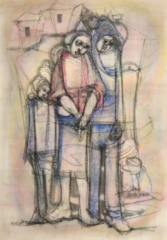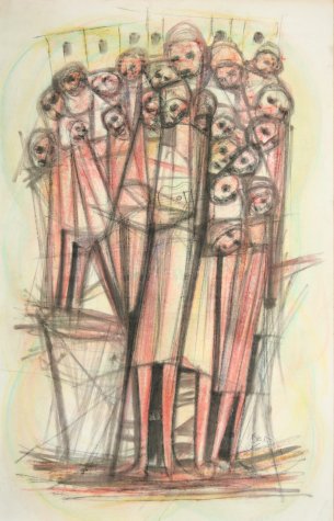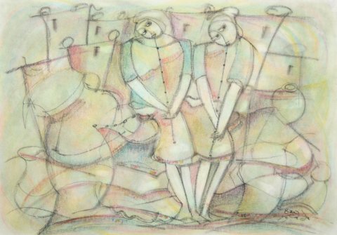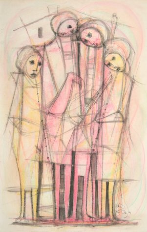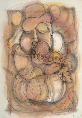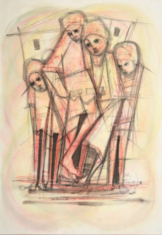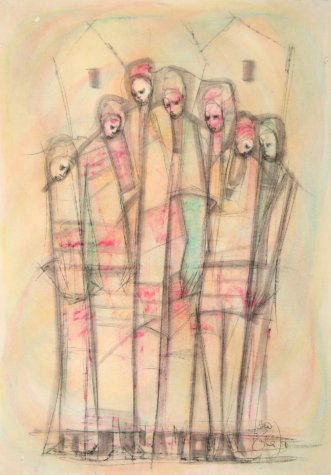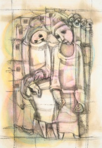 He worked in crayons and mixed media. Some of his earlier faces were Madonna-like, with serene qualities. These later became popularized and stylized and he began presenting these faces in group compositions. His latter works before his death tend to be more refined and also decorative, compared to many of his earlier works. He was one of the first commercial black artists who’s work was seen all over the country, even in the days of Apartheid.