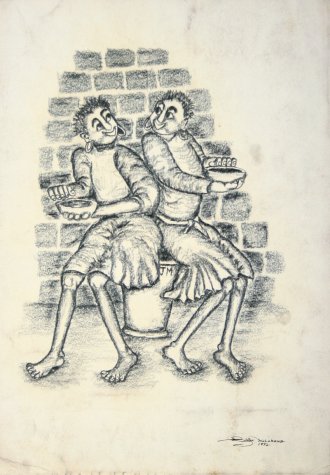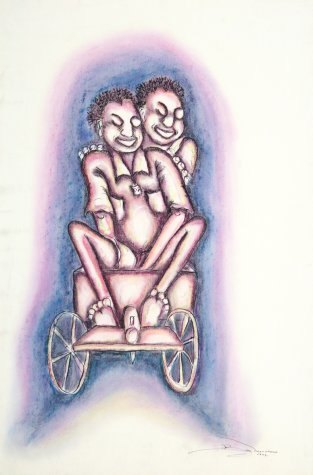 Billy Molokeng’s artistic career began almost inadvertently when his parents died at a young age. Forced to support himself, Molokeng began selling drawings and later paintings. He was eventually sponsored to study art by a patron who recognized his talents, and now works primarily in oil, watercolour, gouache, conte, pencil and charcoal.