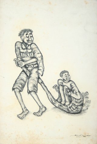 Molokeng’s early work was very much informed by the day-to-day living conditions in the Alexandra Township. Like many of his contemporaries painting in the township manner, Molokeng focused his attention on the interaction between people, filling his compositions with figures and often caricaturizing them.