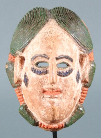 Punu masks are thought to represent ancestors' faces. They are worn during funerals and by a Moukouji initiate who stands on stilts. The masks have realistic, usually white, faces with protruding pursed lips. T-shaped noses, globular protruding eyes incised with a curve, high-domed foreheads and characteristic ridged high coiffures, which reflects the Punu women's style.