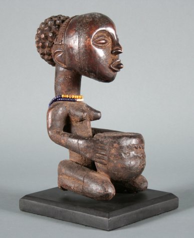 Luba artists created numerous objects that related to the royal court activities. Prestige objects were usually decorated with female figures which are omnipresent in Luba art. As the Luba empire extends over a vast territory, there are a large number of stylistic variations. Luba artists showed their social status through the adze they carry on their shoulders.